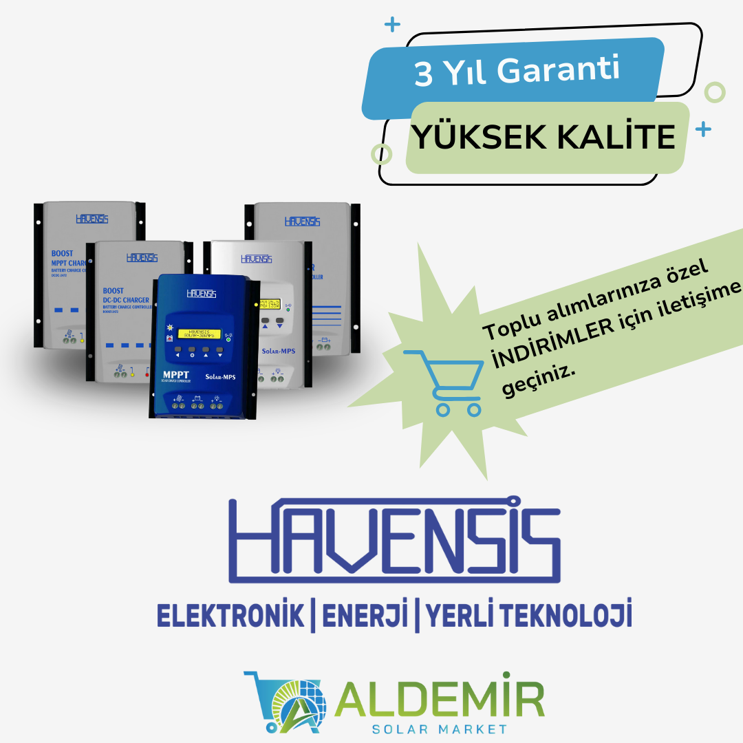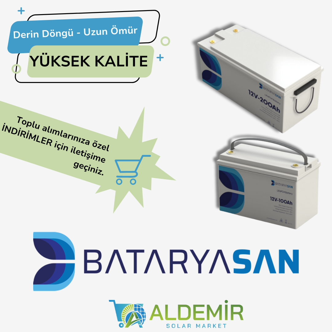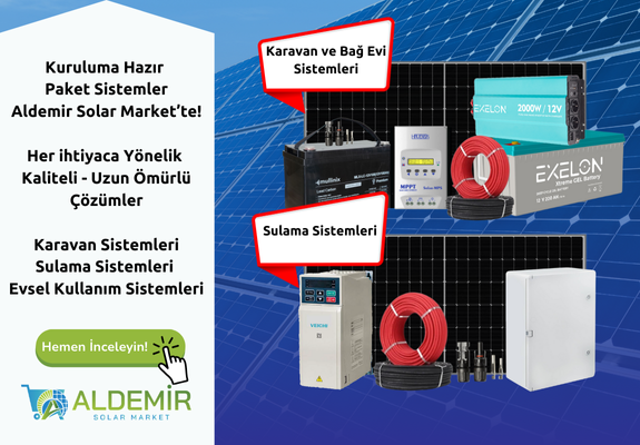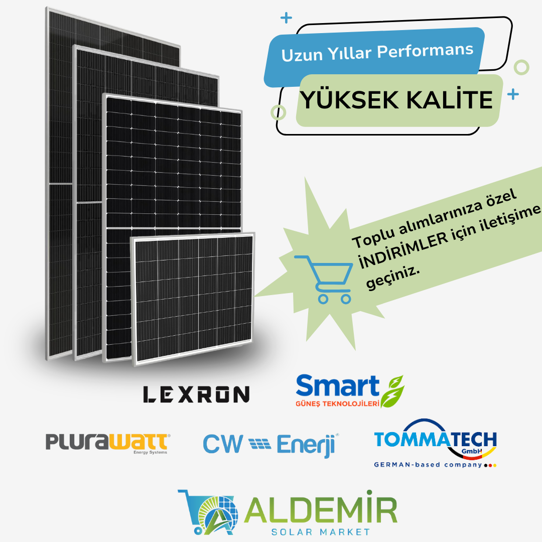 Aldemir Solar Market, yenilenebilir enerji kaynaklarına uygun fiyatlarla erişim sunan bir e-ticaret platformudur. Güneş panelleri ve enerji depolama ürünleri ile maliyetleri düşürürken çevre dostu çözümler sağlamaktayız. Güneş enerjisi ile ilgili sürdürülebilir çözümler sunarak, bireysel ve ticari müşterilerimize uzun vadeli tasarruf imkanı sağlıyoruz. Tamamı çevre dostu ürünlerimiz arasında güneş panelleri, solar inverterler, farklı bütçelere uygun olarak akü çeşitleri, akü şarj cihazları, güneş enerjili aydınlatmalar, solar sulama ürünleri, karavan ve bağ evi sistemleri olarak adlandırdığımız kuruluma hazır solar paketlerimiz bulunuyor. Güneş enerjisi sistemleri ürünleri ve dayanıklı montaj ekipmanlarımızla, evinizi ya da iş yerinizi enerji tasarruflu hale getirmenizi sağlıyor, enerjinizi bağımsızlaştırıyoruz. Yüksek kaliteli ürünlerden oluşan solar paketler ve montaj ekipmanları ile güneş enerjisi sistemlerinizin kurulumunu kolaylaştırıyoruz. Çevreye katkıda bulunurken enerji maliyetlerini azaltacak çözümler sunuyor ve verimli enerji depolama seçeneklerimizle gece ve bulutlu günlerde bile sizlere enerji kullanımı avantajı sağlıyoruz.